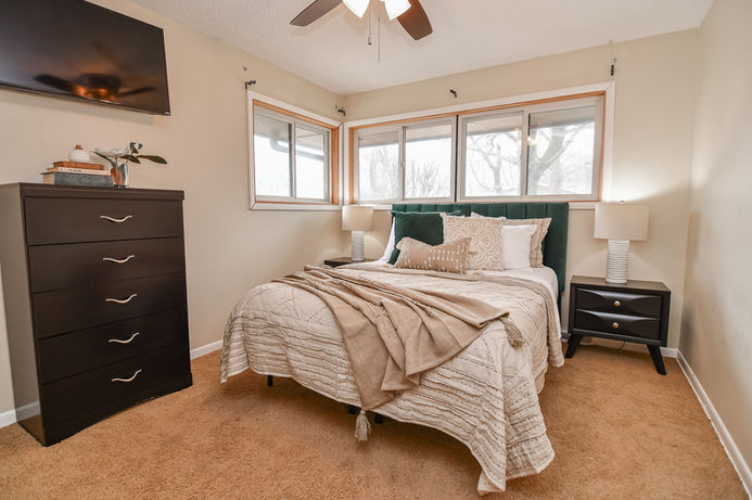 Furniture placement and styling helped clearly define the living spaces while ensuring the home photographed beautifully for marketing. For resale properties, staging often goes beyond aesthetics. The goal for this project was to remove potential red flags for buyers and present the home in a polished, balanced way that allows its best features to stand out.