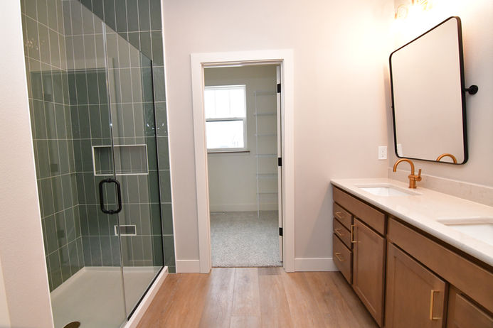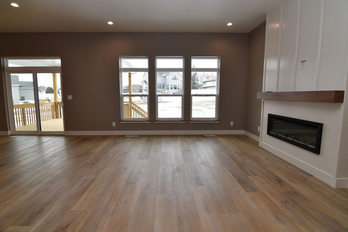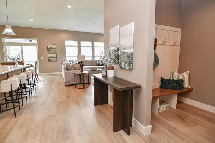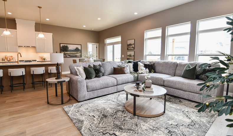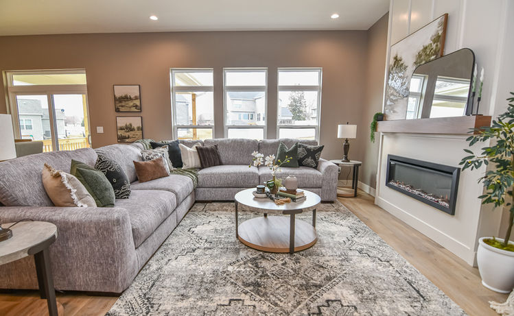 For this Skogman Homes new construction in Waterloo, Iowa, we staged the main floor including the entry, home office, great room, and primary suite. The design pulled directly from the home’s finish selections, using a moody green, warm gray, brown, and tan palette to create a cohesive and inviting atmosphere. Layered textures, clean-lined furnishings, and warm tones highlight the architecture while helping buyers easily envision how the spaces can live and function.
