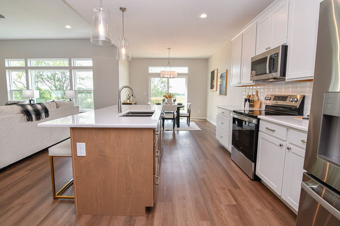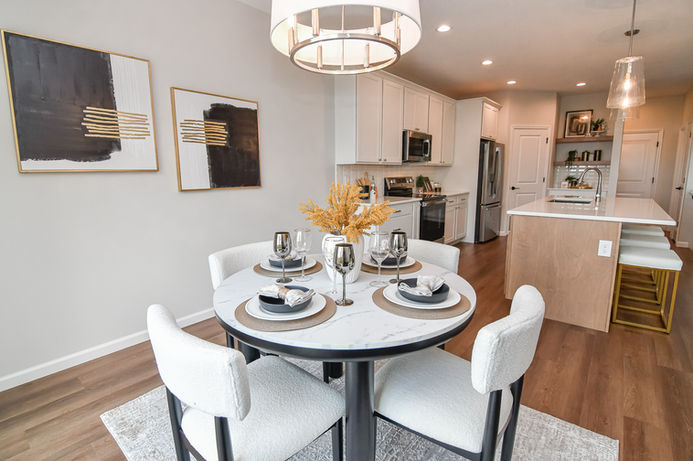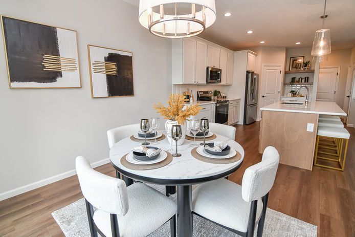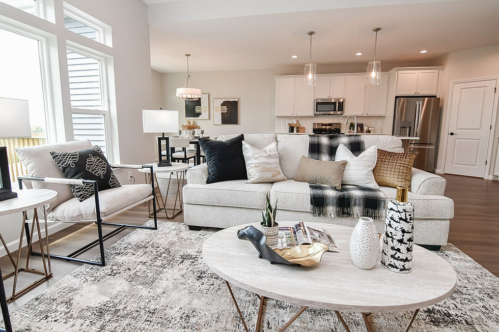 For this new Skogman Homes build, we staged the main floor spotlighting the great room and primary suite to showcase scale, flow, and everyday livability. A cohesive black-white-gold palette adds modern contrast and a touch of luxe for photo-ready impact.