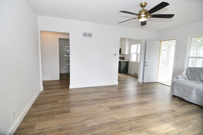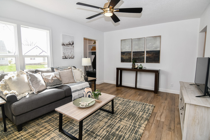 This flipping team wanted to showcase their "small" but adorable fully renovated 1.5 story home. We staged the entry, living, eat-in kitchen, 3 seasons room, bathroom and primary bedroom to show buyers just how big and how much functional space there is in this home. We took our color palette from the custom green cabinetry and natural light that floods the house to create a cozy, bright feeling the moment you walk in the door.